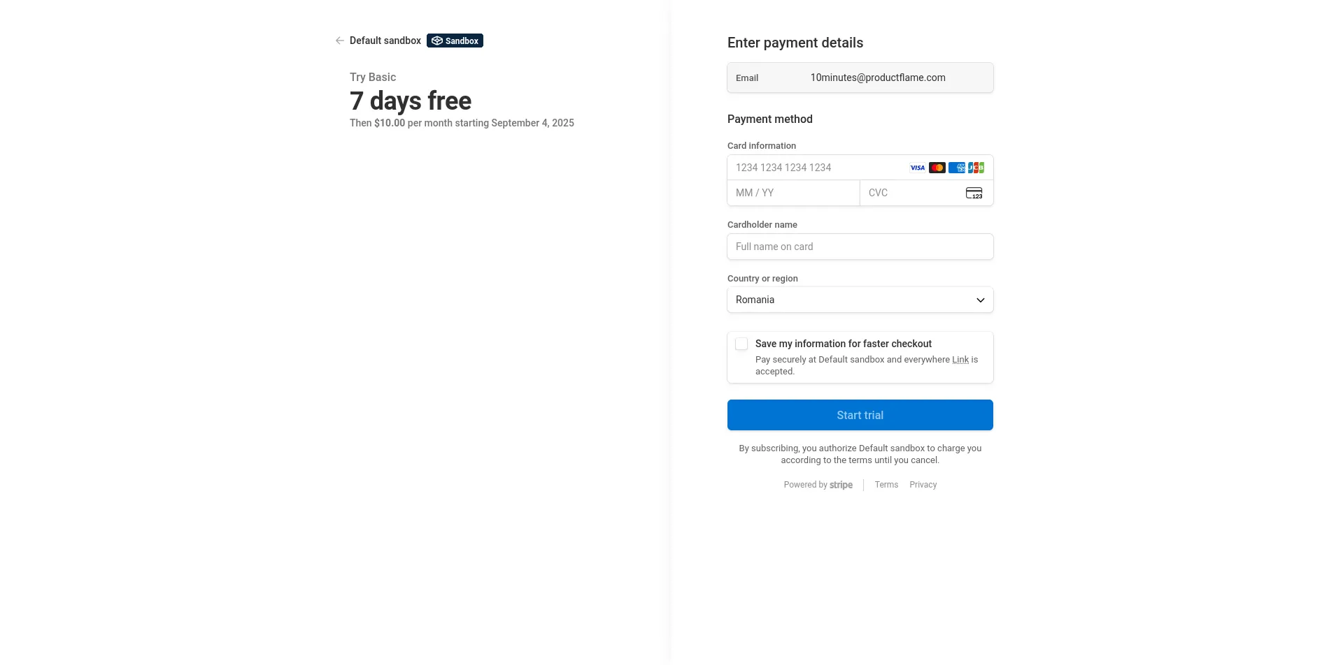 Section titled “Before we begin”- We assume that you already have created a stripe project for your application and and retrieved your stripe secret key. If not click here. Both production and test modes are compatible with Productflame.