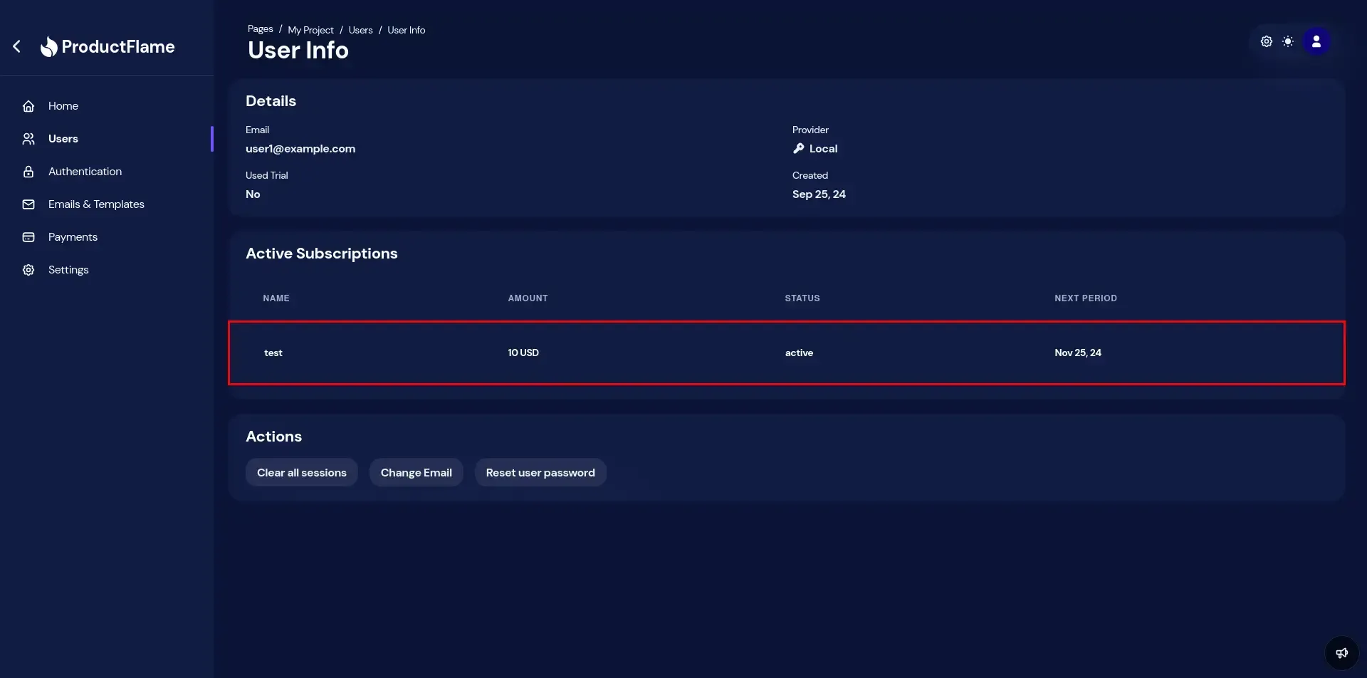 - Here’s the user interface, where you can access personal details and manage both the user and their subscriptions.