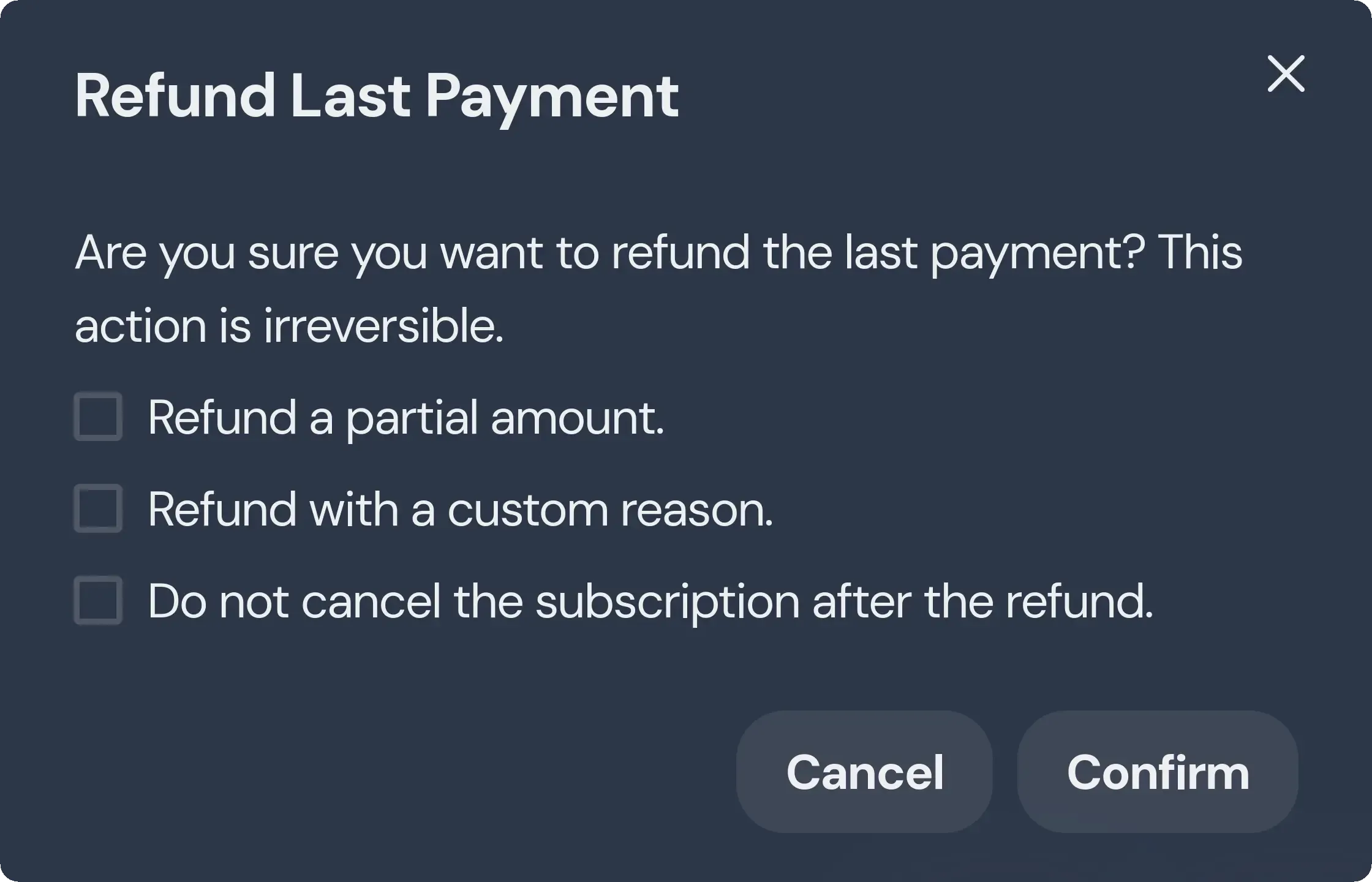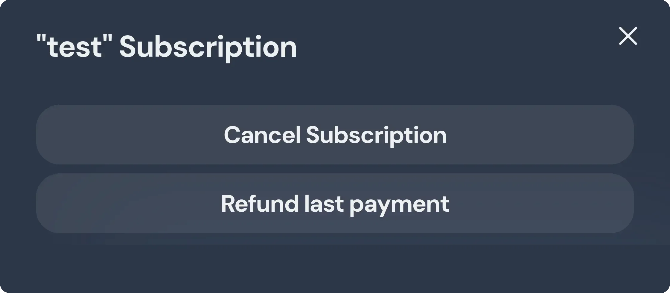 Section titled “Refund last payment”You can refund the most recent subscription payment using the options available here:
