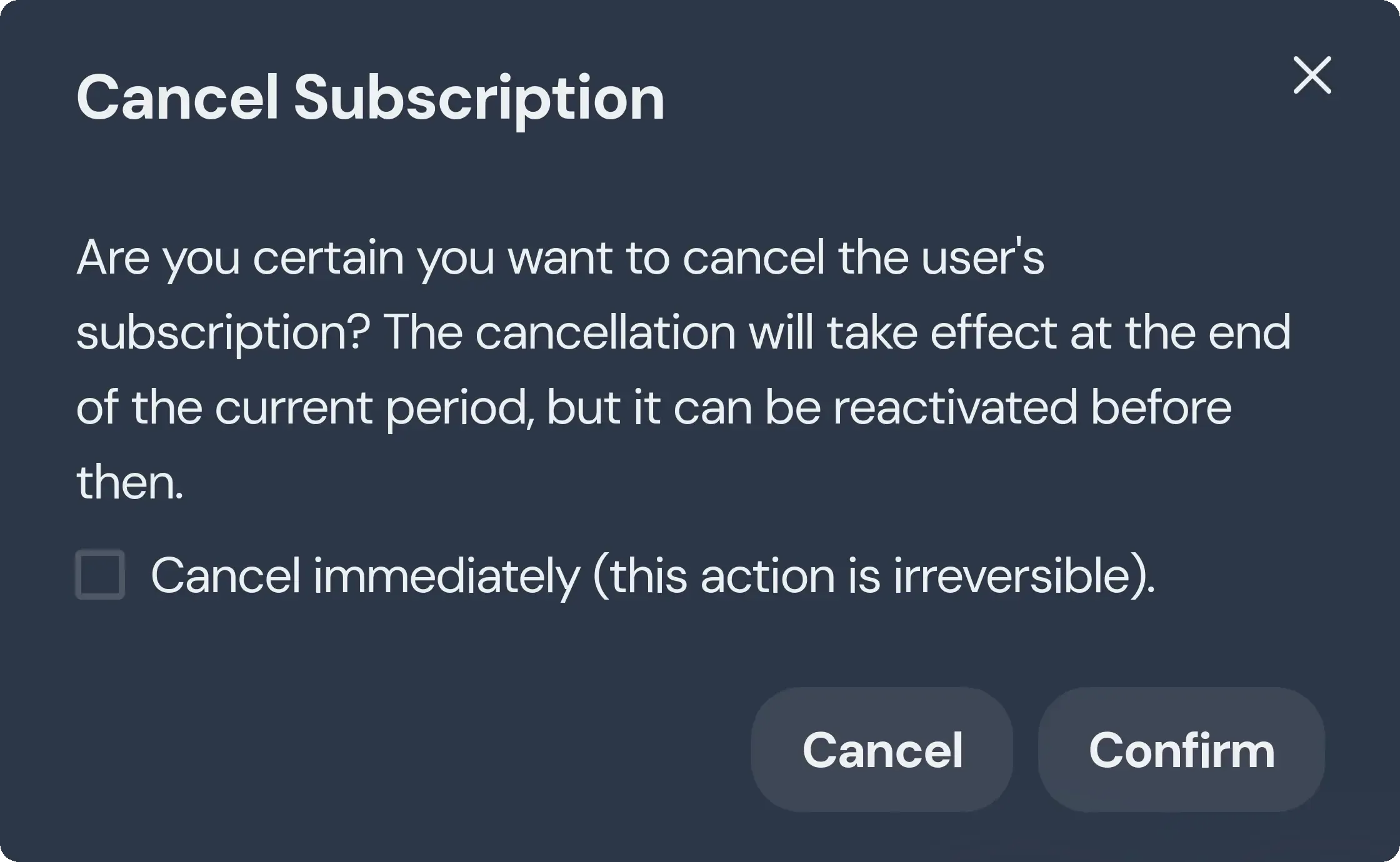 Section titled “Cancel subscription”You can cancel the user’s subscription here, either immediately or at the end of the billing period. Cancelling immediately will prevent reactivation, requiring the user to redo the payment process.