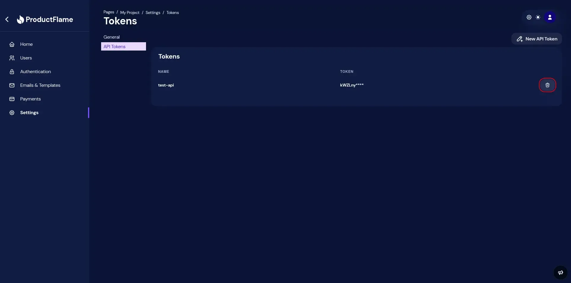Section titled “Delete Token”You can delete a token from the same place where you created it. Deleting a token will cause it to be invalidated when trying to call the api with it.